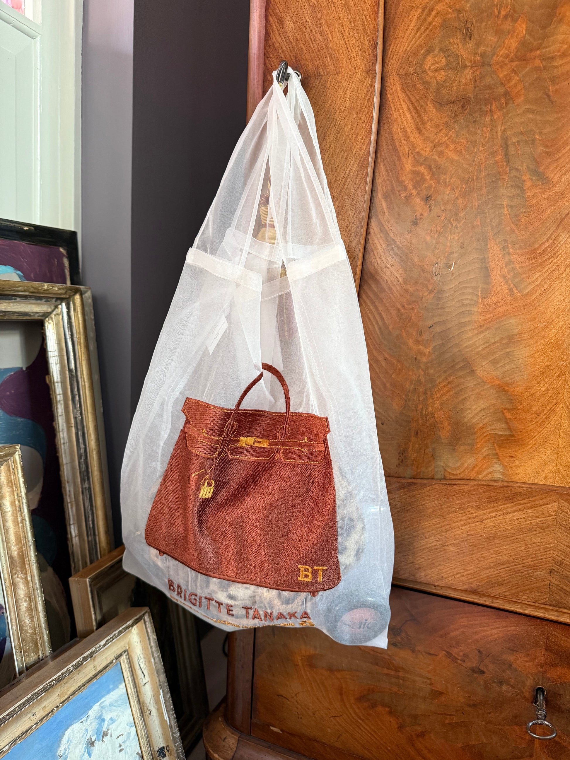 Elevate your everyday errands with a touch of Parisian wit. Designed by the French-Japanese duo Brigitte Tanaka, this organza bag is a poetic twist on the classic plastic grocery sack. It’s light as air, yet surprisingly strong—bringing a bit of "Creme de la Creme" elegance to your grocery shopping, flower runs, or city strolls. Made from organza and cotton embroidery.