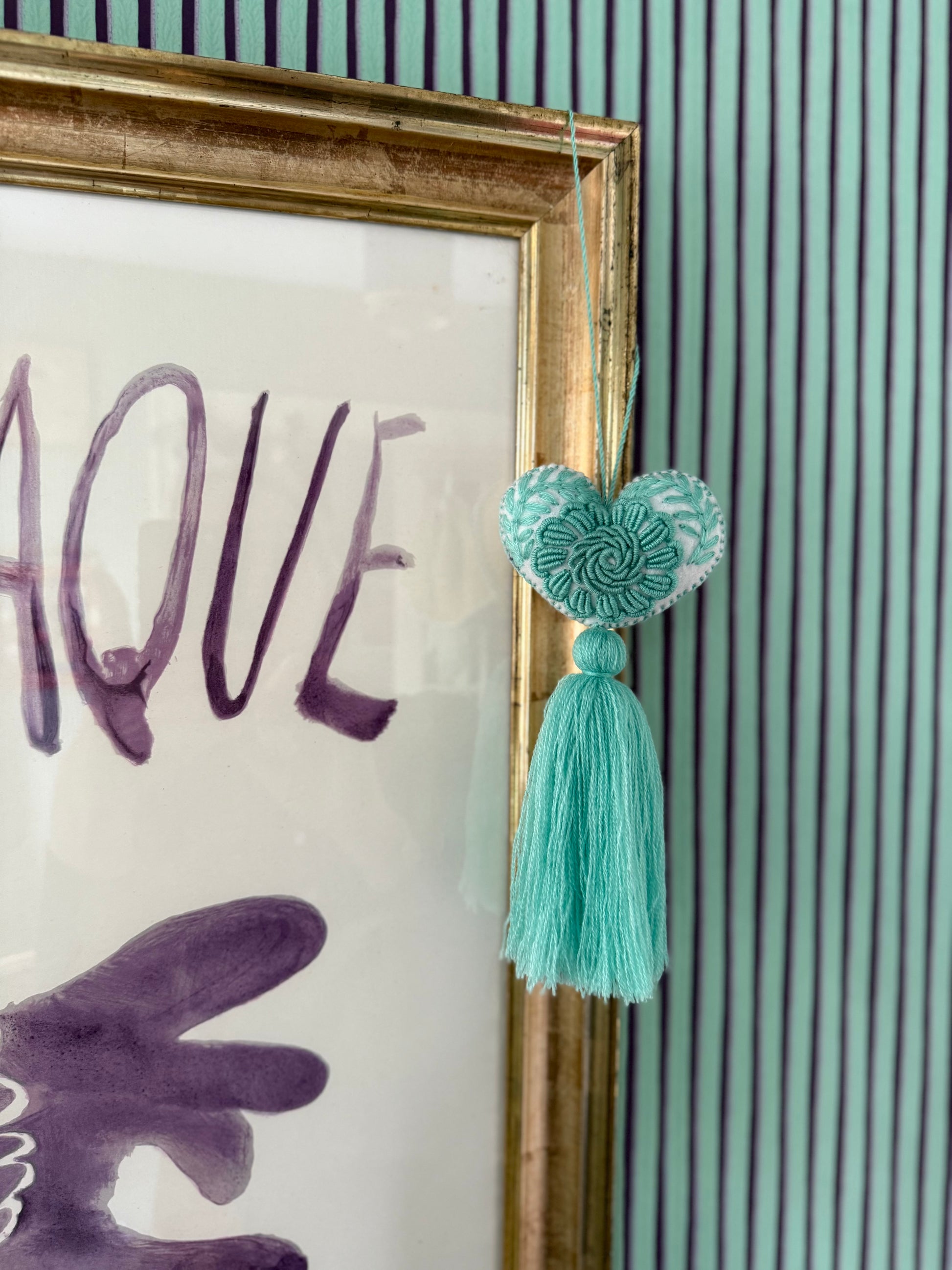 A small wall decoration created from old, traditional hand embroidery from Mexico, carefully stitched onto thick wool. Each piece carries the warmth and history of skilled hands and timeless craft.
